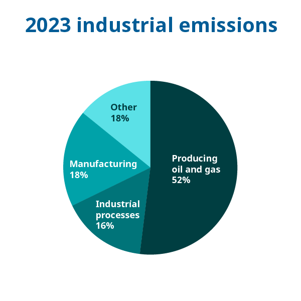 In 2023, producing oil and gas in B.C. caused 52% of our industrial greenhouse gas emissions. Other industries combined made up the remainder: